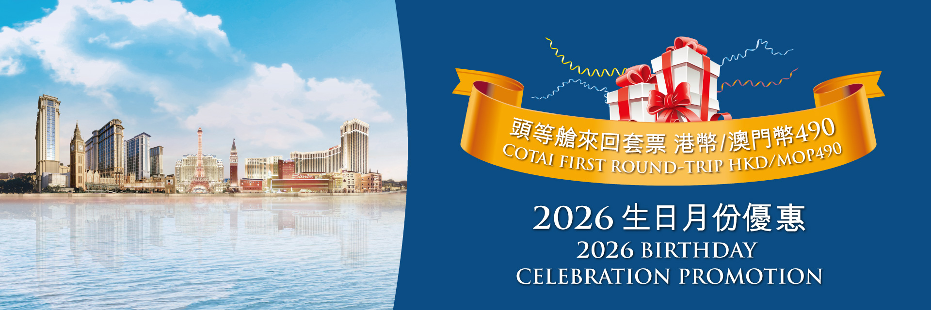 Passengers whose birthdays are in the same month of the departure date, can purchase Cotai First round-trip tickets for HKD/MOP490 per set, by presenting valid identification document (e.g. Macao or Hong Kong ID, passport for international passengers or Exit-Entry Permit for Travelling to and from Hong Kong and Macao issued by Mainland China).